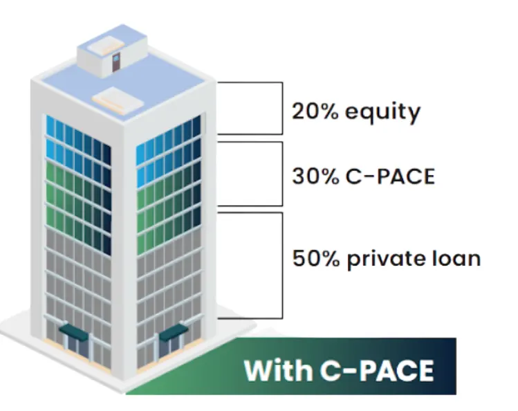 C-PACE (Commercial Property Assessed Clean Energy) is a low-cost, non-recourse financing option for projects that improve a building’s energy performance or resilience against natural disasters. C-PACE is an alternative to more expensive options like mezzanine loans, debt funds and outside equity. C-PACE loans are repaid through a special tax assessment on the property, with terms up to 30 years. C-PACE is available for commercial, multifamily, and industrial buildings only.
